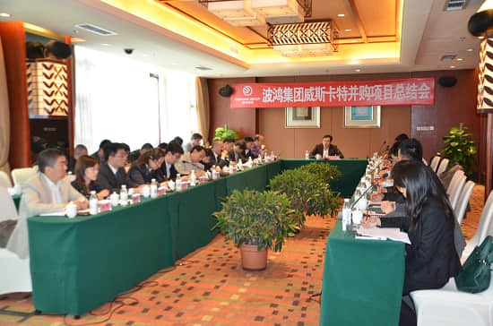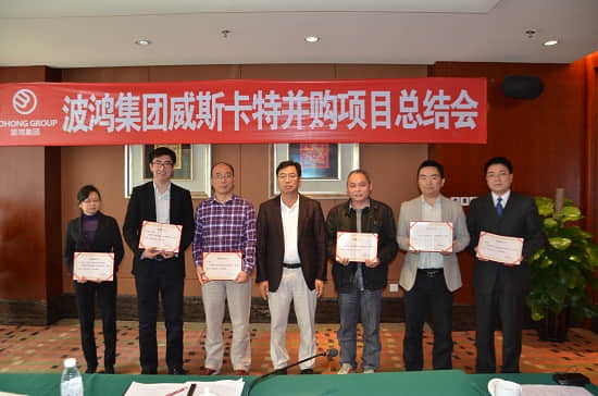 为表彰在此次并购项目中做出突出贡献的团队和先进个人,也为更好的总结并购过程中的经验教训,波鸿集团并购威斯卡特项目总结会于2013年4月14日在都江堰青源国际大酒店隆重举行。集团总裁董平、常务副总裁杨华勇、副总裁刘宗金等集团领导及参与并购项目的员工代表共四十余人出席总结会,会议由集团总裁助理张丽主持。