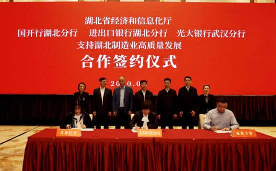 9月21日,湖北省经信厅与国开行湖北分行、进出口银行湖北分行、光大银行武汉分行合作推进制造业高质量发展建设签约仪式成功举办。省政府副省长曹广晶、副秘书长钟芝清出席并见证本次签约。