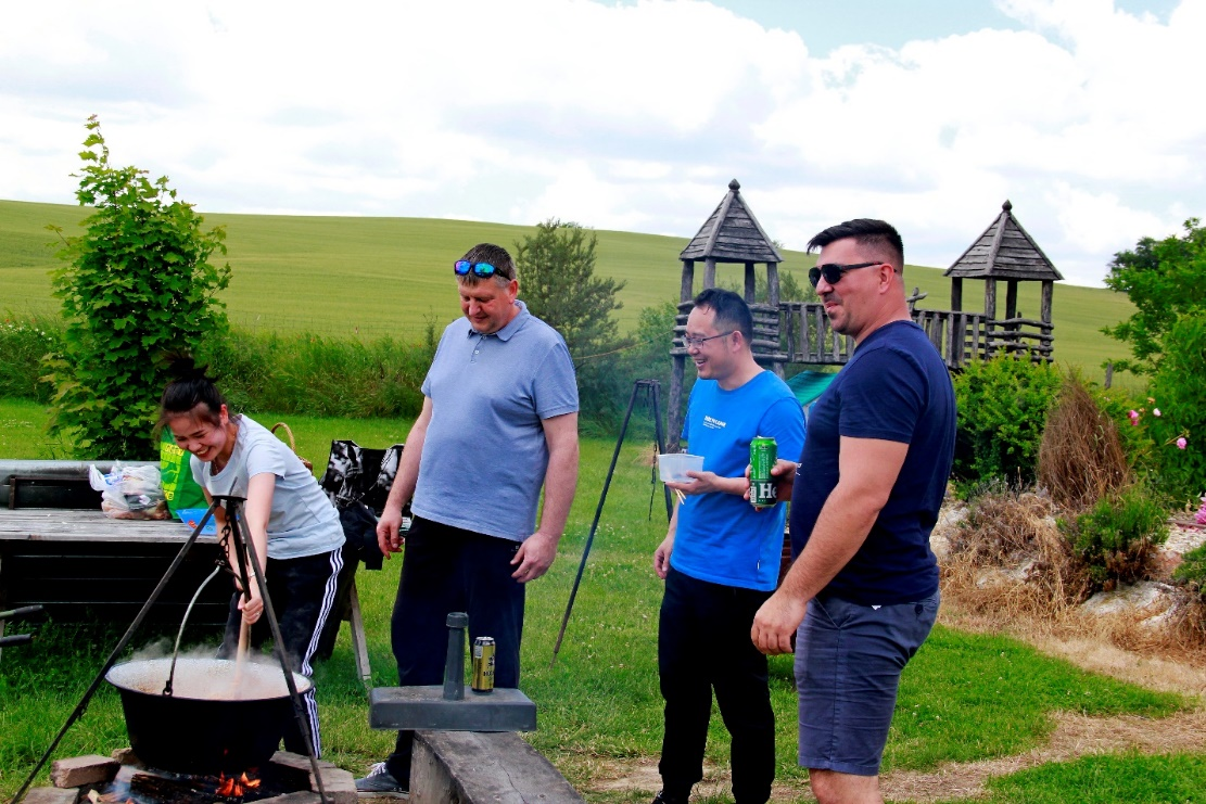 天朗气清,惠风和畅,三三两两,笑语盈盈。或举杯对饮,共享惬意时光,或邀朋引伴,一起泛舟湖上。中方员工早早地为活动备好了糖醋排骨、白斩鸡、蒜泥白肉、卤牛肉等特色中式菜肴,而大家在现场烹制的匈牙利特色家常菜——大锅炖肉成为了当天活动的主菜,浓郁的汤汁,加上高品质的猪肉,在柴火的烹煮下,香味弥漫开来,让人垂涎欲滴。
